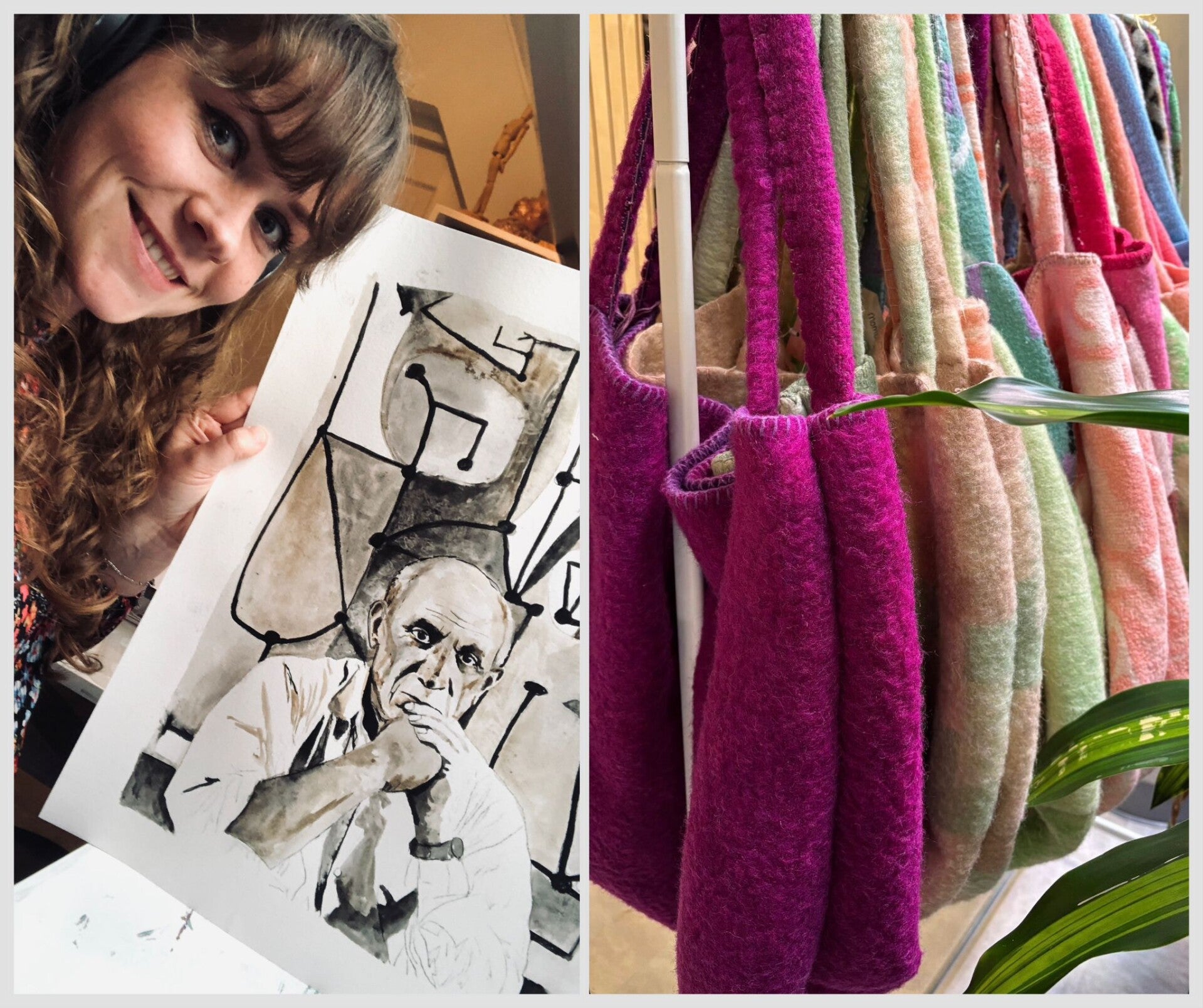 Ik ben Nicole, een creatieve maker onder de naam NicoleRadstakeArtwork. Als beeldend therapeut werk ik met kinderen, jeugd en gezinnen. Daarnaast heb ik 100 hobby’s, waaronder het maken van portretten en abstracte kunst, waarbij ik veelal gemengde technieken gebruik. De mombags zijn gemaakt van oude (wollen) dekens. Handig voor aan de kinderwagen, een weekendje weg of om mee te gaan shoppen. Op de kerstmarkt van Makerstraat neem ik van beide genoeg mee. En wil je een portrettekening of andere beeldende kunst in opdracht? Daarover kunnen we in gesprek gaan. Tot snel! Groetjes Nicole